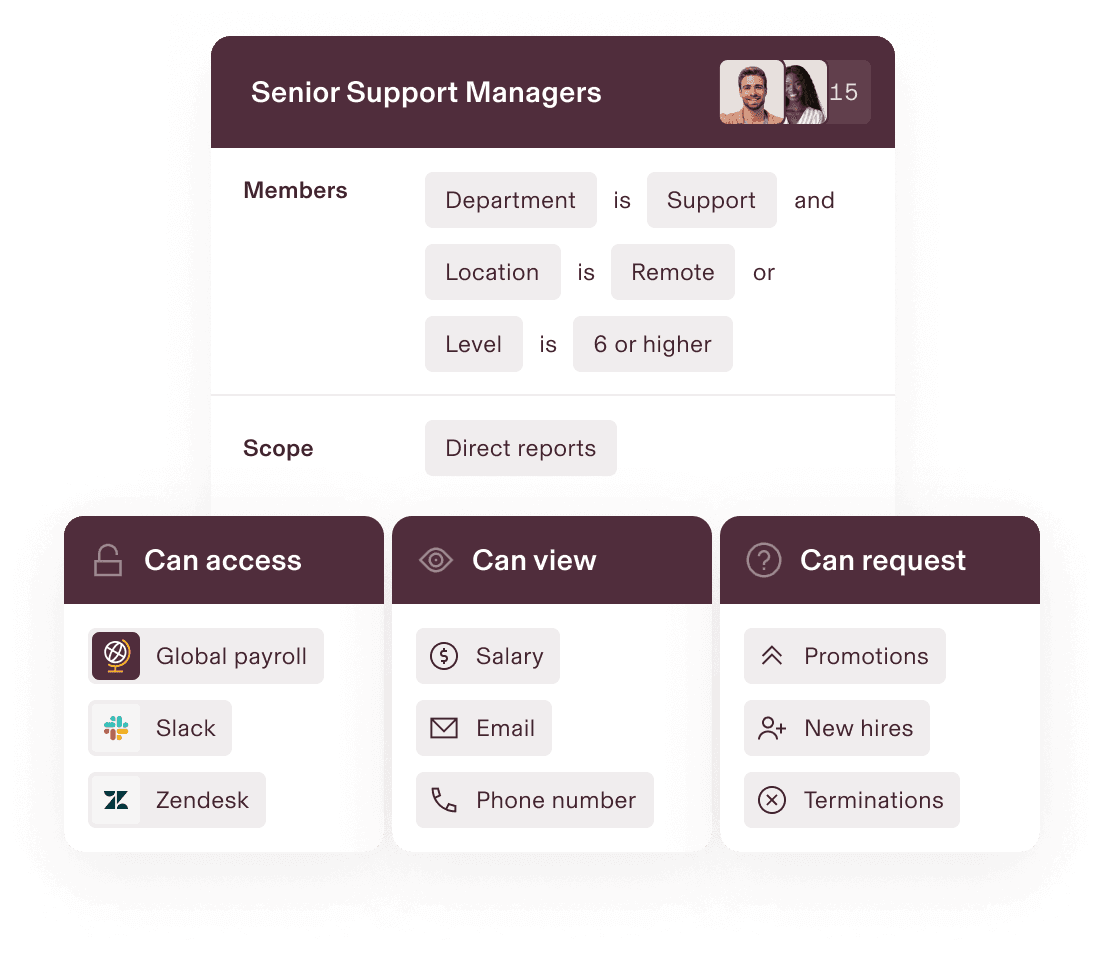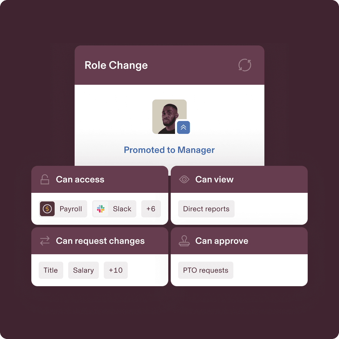 Permission profiles allow you to build a configuration of permissions that can be attached to different users. In most systems, permission profiles have to be individually assigned to users, saving you only from the manual work of rebuilding a profile. In Rippling, permission profiles are attached to specific employee attributes, like level or department. As employees get promoted, move teams, or experience other changes, their permissions will dynamically update, so you don’t have to perform any manual work.